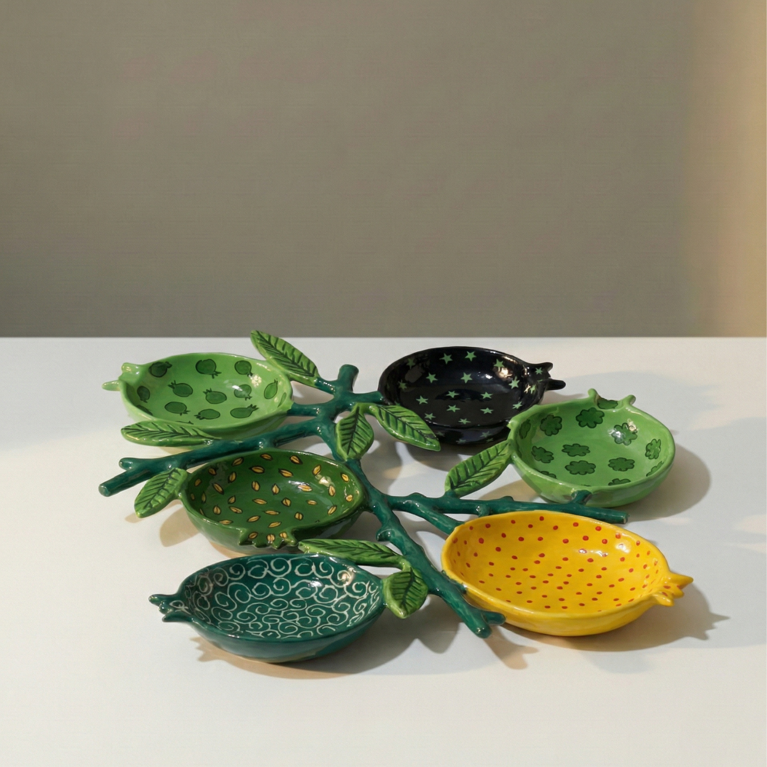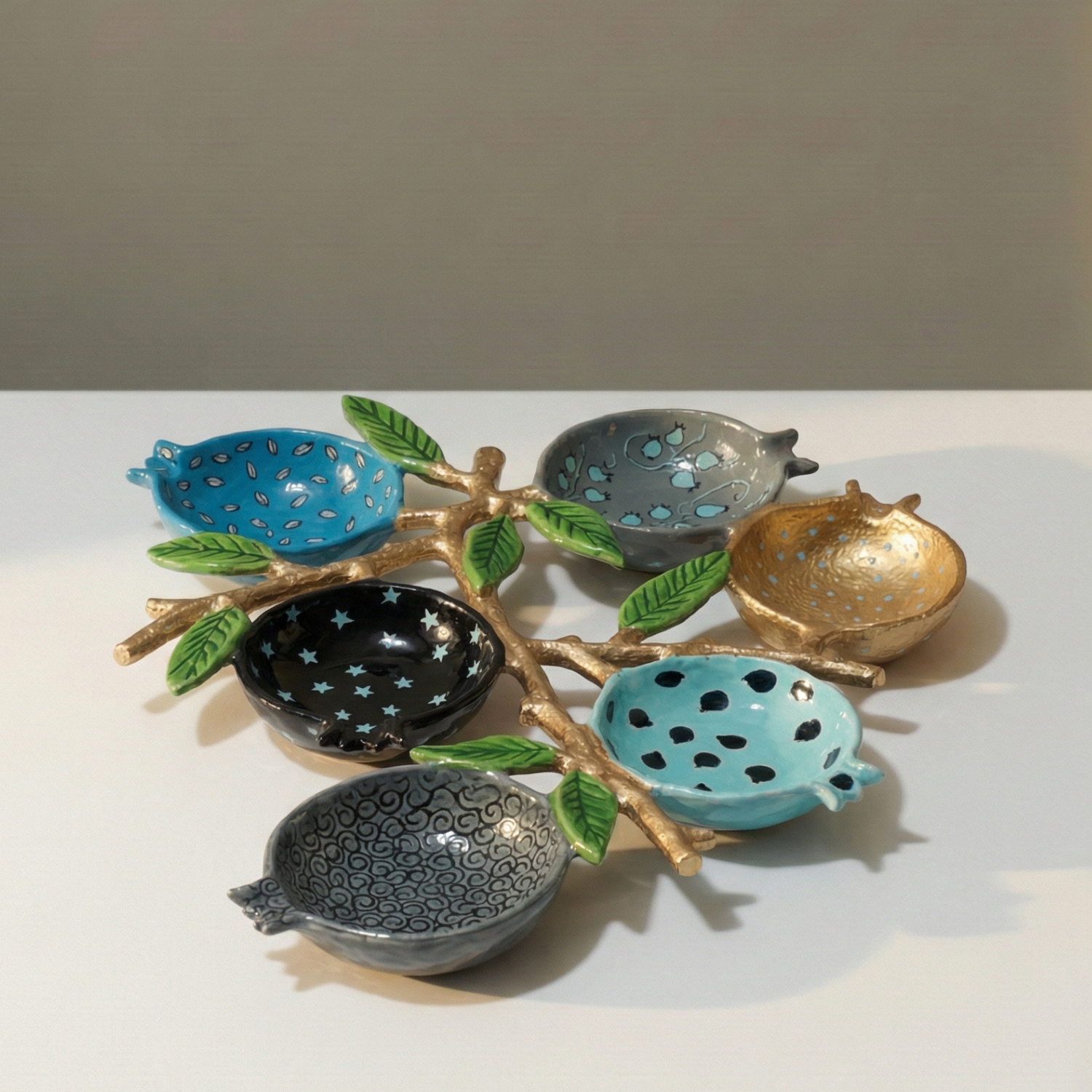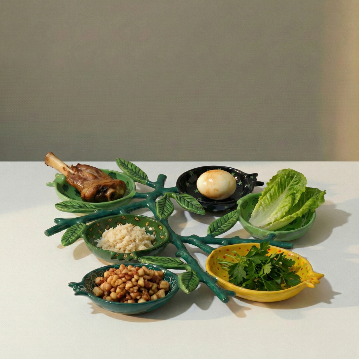 העיצוב העשיר וההרמוני מעניק פרשנות שמחה ומלכותית לקערת הסדר המסורתית – מושלם למי שאוהב צבע, עומק ואמירה עיצובית ברורה.