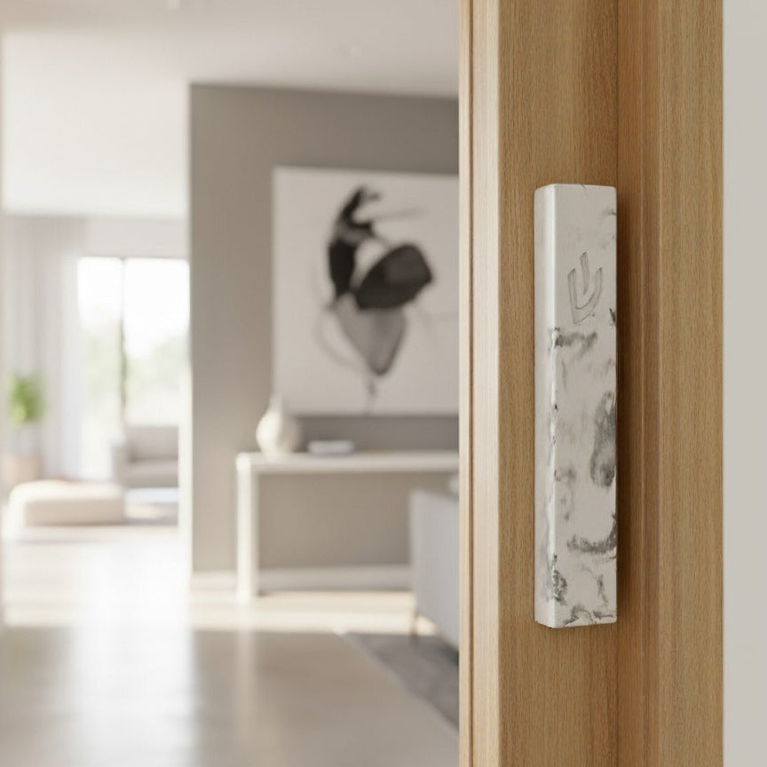 בתי מזוזה מודרניים בשורה בגימור טרצו, שיש ובטון חלק, עם חריטת ש&
