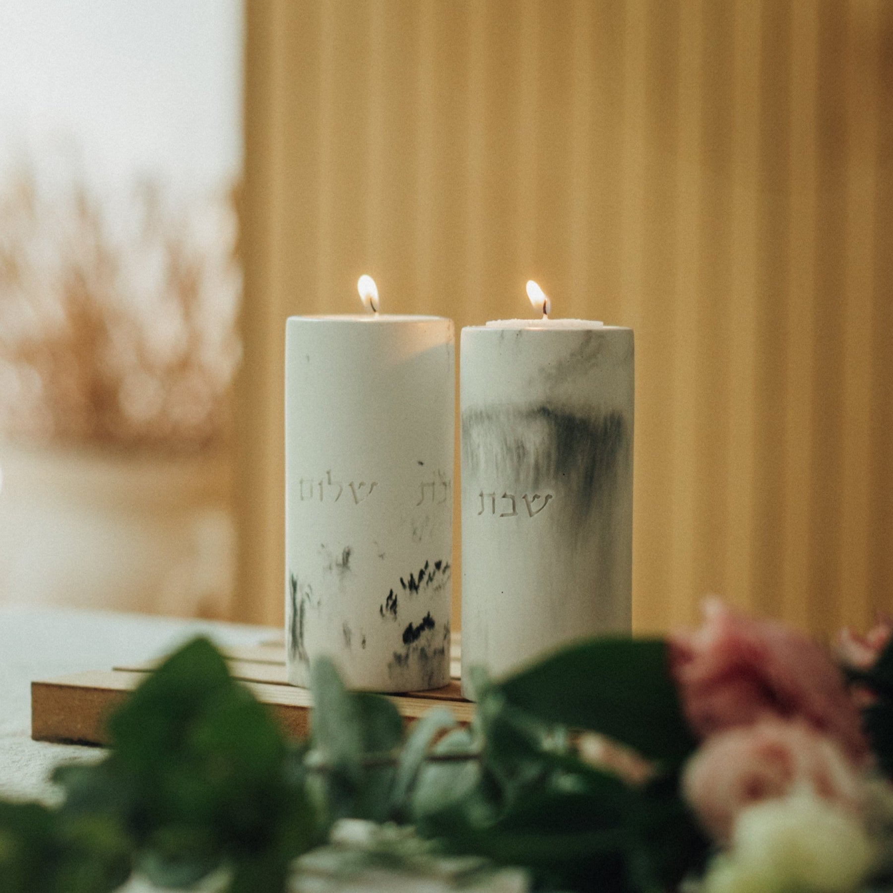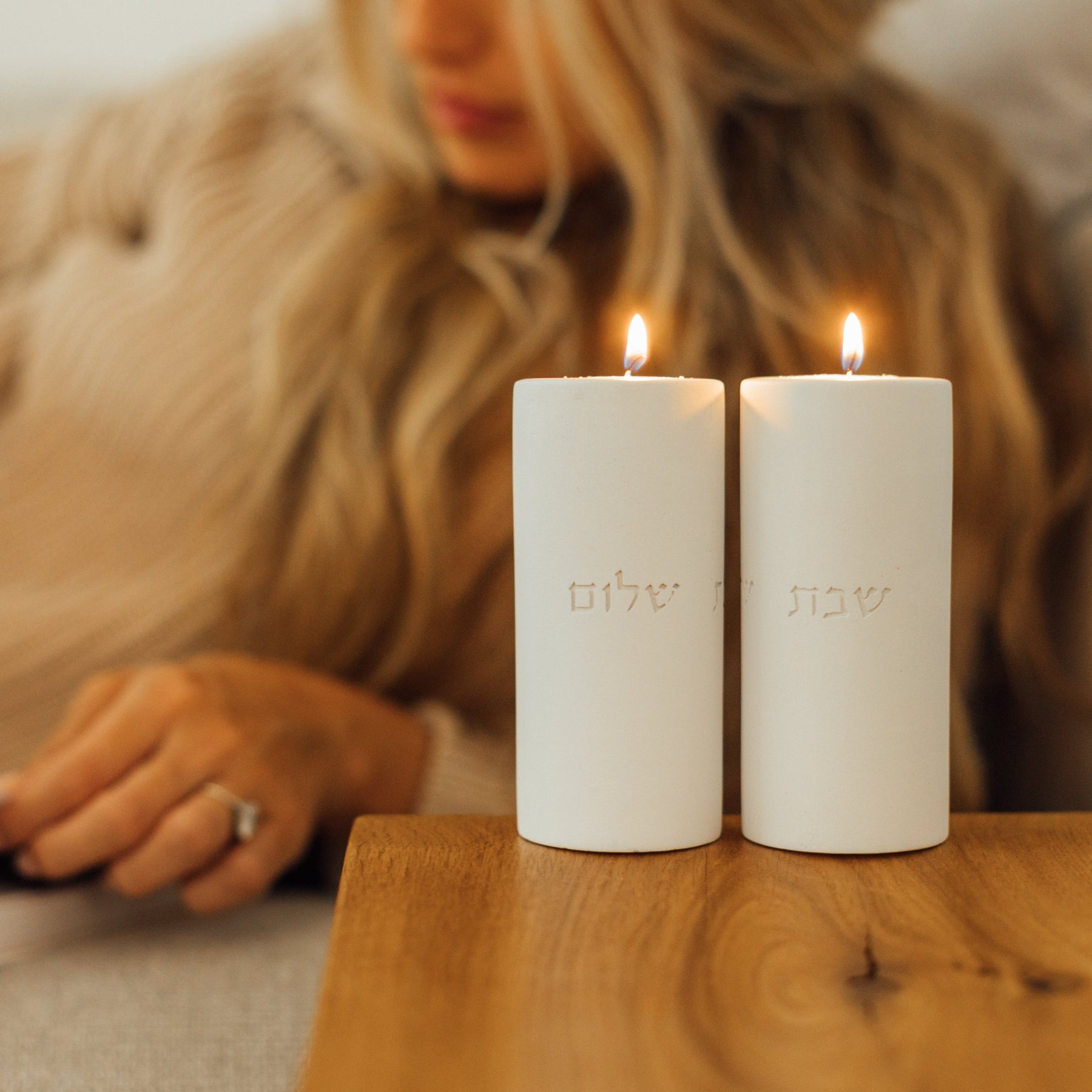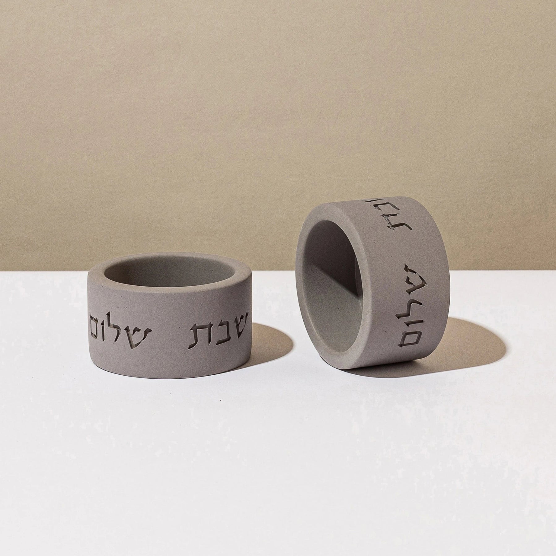 זוג פמוטים בעיצוב מינימליסטי, עשויים בטון טבעי בגימור חלק ונקי. כל פמוט כולל כיתוב "שבת" בצד אחד ו"שלום" בצד השני, בעיצוב אלגנטי שמחבר בין מסורת לניקיון עיצובי.