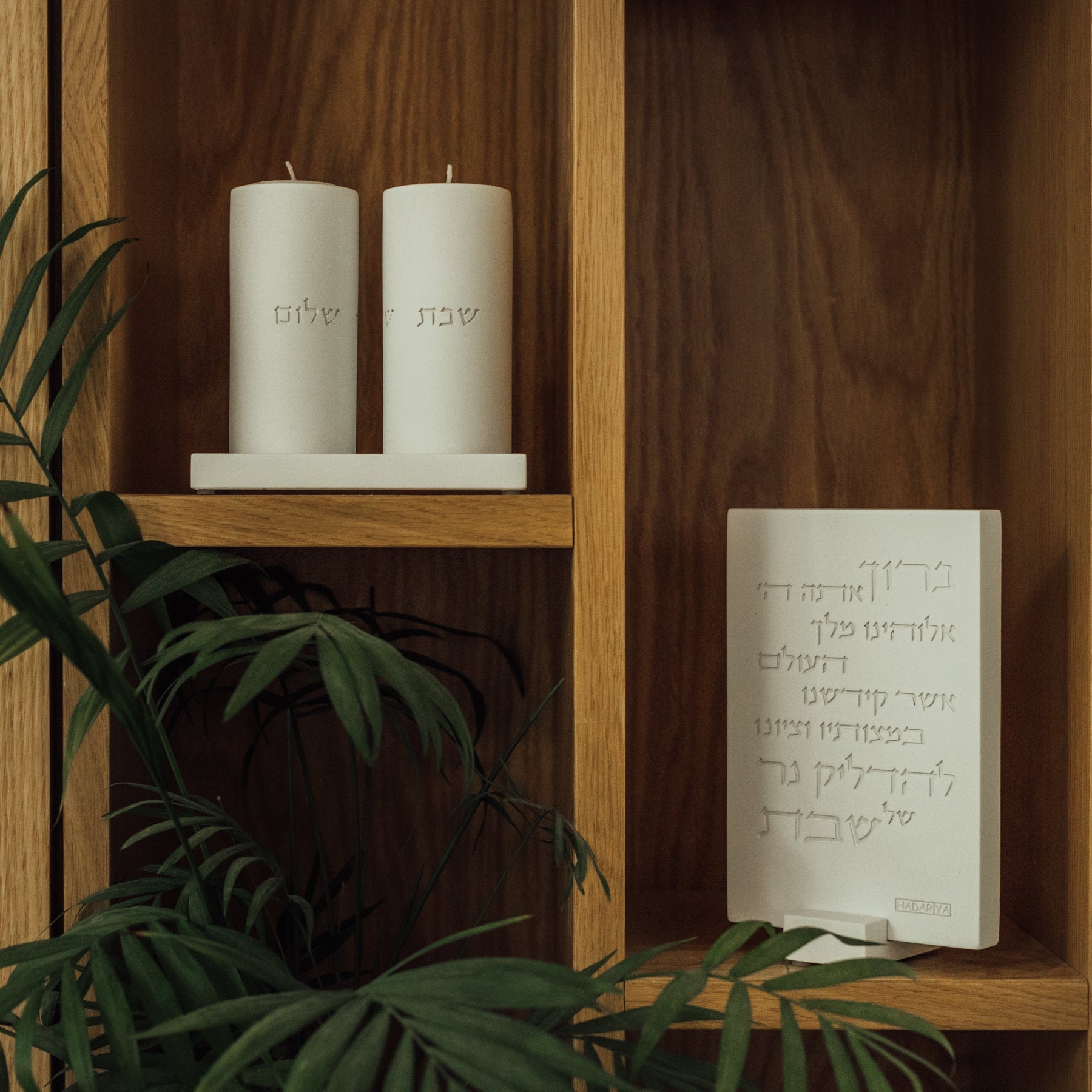 סט פמוטים לשבת עם מגש בטון מעוצב וברכת הדלקת נרות חרוטה מבטון - דגם Shabbat Loft