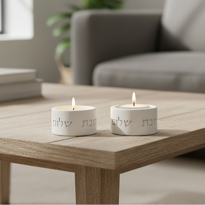🕯️ כולל: זוג פמוטים – עם כיתוב "שבת" ו"שלום" משני הצדדים